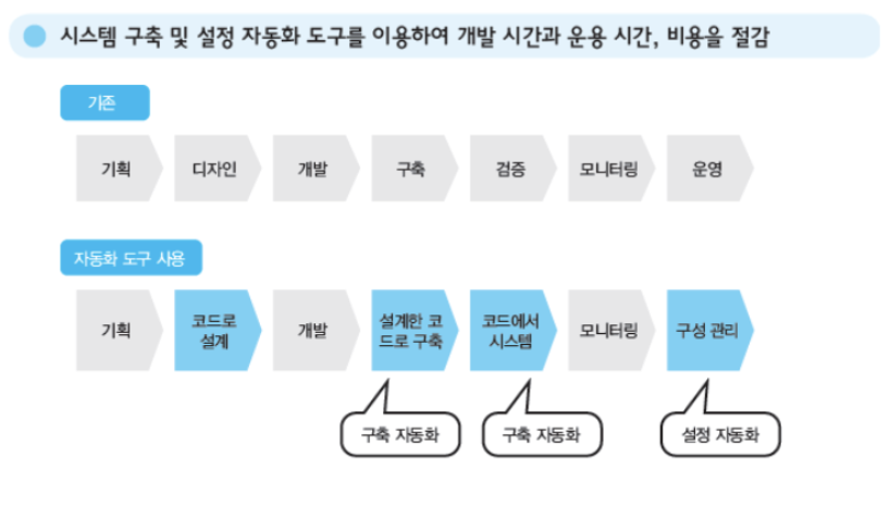 구축작업의 자동화를추진하면개발및운영기간을개선할수있으며개발, 테스트, 운영 비용의 절감을 꾀할 수 있습니다.