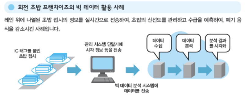 클라우드 서비스를 이용하여 빅 데이터를 활용한 대표적인 사례로는 어느 회 전 초밥 프랜차이즈의 사례가 유명합니다. 초밥을 서빙하는 접시 위에 IC 태그 를 붙여 초밥 단품을 관리하고, 특정 시간 이상 레인 위에 있었다면 자동으로 버려서 신선도를 유지합니다. 또한 1분 후와 15분 후의 수요를 예측하고 공급 지시를 내려, 폐기 음식의 양을 1/4까지 줄일 수 있었다고 합니다.