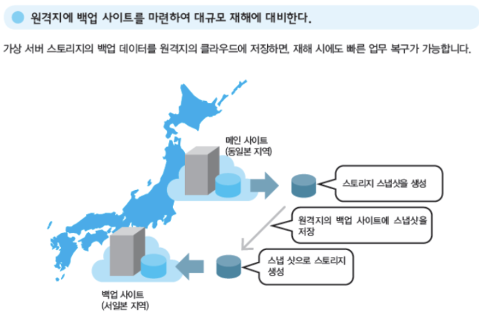 클라우드 서비스는 리소스 변경에 유연성을 제공하므로 백업 사이트 이용에 적 합합니다. 평소에는 서버 및 데이터베이스 스냅 샷(특정 시점의 디스크 상태)만 백업 사이트에 저장하는 용도로 놔둡니다. 그리고, 메인 사이트가 다운되었을 경우에 스냅샷으로 서버와 데이터베이스를 빠르게 복원시킵니다.