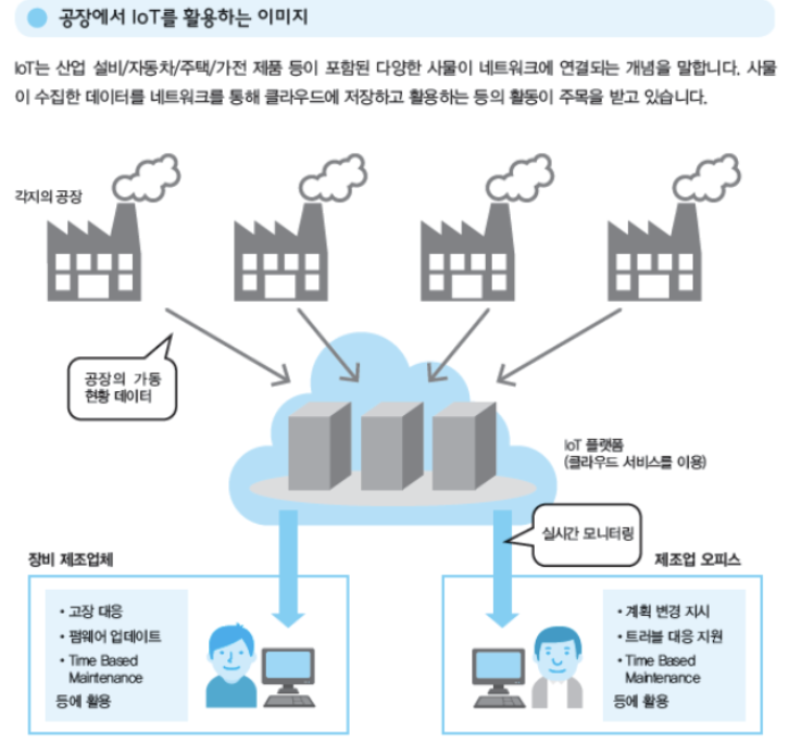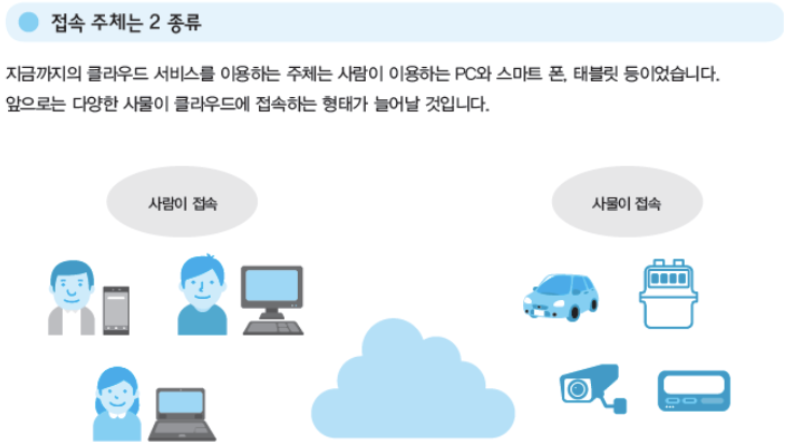 지금까지의 클라우드 서비스의 이용 방법은 PC나 스마트폰처럼 사람이 이용하 는 디바이스를 통해 클라우드에 접속하는 형태가 대부분이었습니다. 그러나 앞 으로는 공장이나 자동차 등 다양한 사물이 클라우드에 접속하여 방대한 자료를 수집하고 분석하여 비즈니스에 활용하려는 움직임이 퍼지게 될 것입니다.