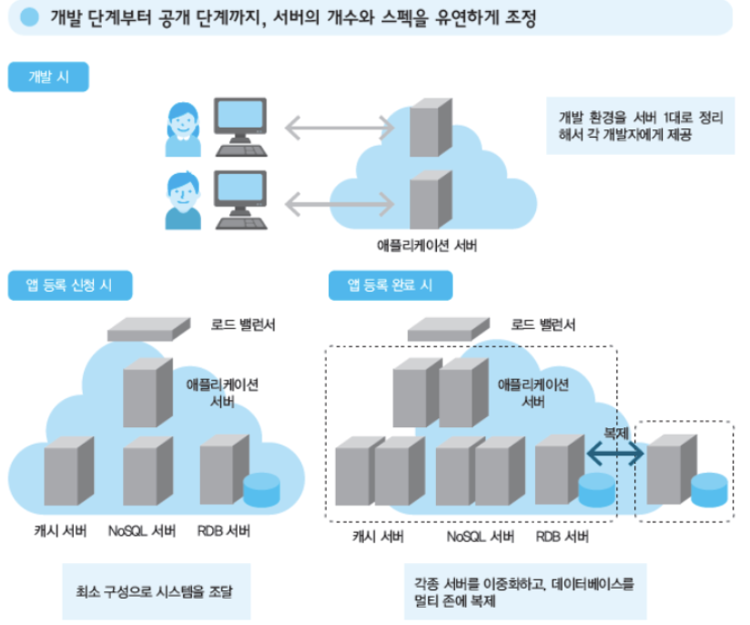 이방법과클라우드는매우궁합이좋다고할수있습니다.기업의성장과사업 확장에 따라 컴퓨팅 리소스를 늘리거나 줄여서, 더욱 효율적인 리소스 환경 아 래에서 서비스를 개발할 수 있습니다. 또한, 자사의 시스템 구축과 운영에서 해 방되므로 자사의 핵심 업무와 고객에게 이익이 되는 업무에 집중할 수 있습니다.