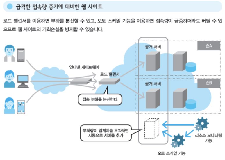 EC, 동영상, 이미지, 광고 등 대량의 콘텐츠를 제공하는 웹 사이트의 기반으로 클라우드 서비스를 사용하는 사례가 늘어나고 있습니다. 이러한 웹 사이트는 미 디어에 노출되거나, 소셜 미디어로 퍼지게 되면 급격하게 접속량이 증가하는 경 우가 있습니다. 따라서 표시 속도가 느려지거나 서버가 다운될 우려가 있습니다. 따라서 접속량이 급증하여 웹사이트에 부하가 걸리는 상황에 대비하여 가상 서 버의 자원을 자동으로 확장하는 오토 스케일과 다른 존의 서버로 부하를 분산하 는 등의 수단으로 대응합니다.