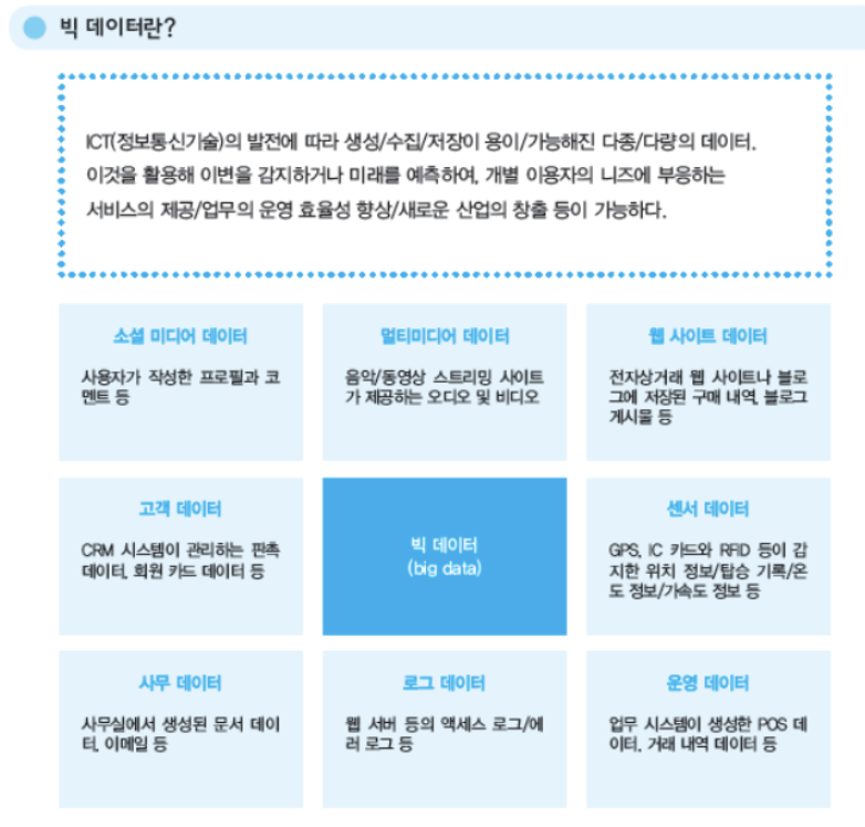 ‘빅 데이터’라고 하는 대량의 다양한 데이터를 비즈니스에 활용하려는 움직임 이 활발해지고 있습니다. 빅 데이터를 ‘과업에 도움이 되는 연구 결과를 끌어 내기 위한 데이터’로 설명하기도 하지만, 명확한 정의는 존재하지 않습니다. 이해를 돕기 위해 간단히 설명하자면, 빅 데이터는 일반적인 데이터베이스 소 프트웨어가 처리할 수 있는 범위를 넘어서는 크기의 데이터를 말합니다. 그 크 기가 수십 테라바이트에서 페타바이트에 달하는 데이터로 상상해도 좋습니다.
