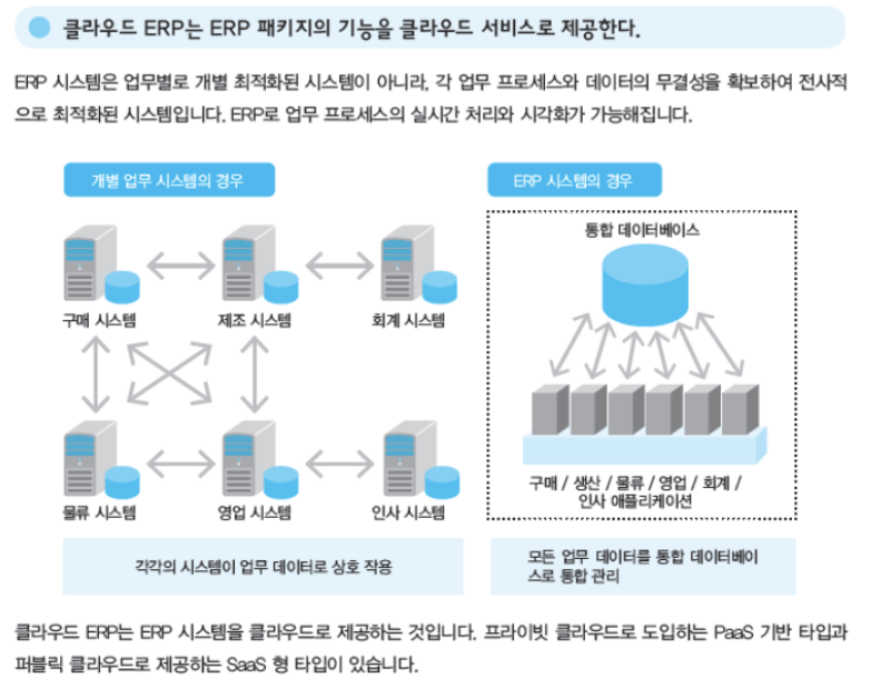 ERP는 업무별로 개별 최적화된 시스템이 아니라, 통합 데이터베이스를 통해 데 이터와 흐름을 통합 관리하므로 업무를 실시간으로 시각화할 수 있습니다. 지금 까지의 ERP는 대기업 중심의 도입이 대부분이었지만, 클라우드 ERP가 등장함 으로 인해 중소기업에서도 도입이 진행되고 있습니다.