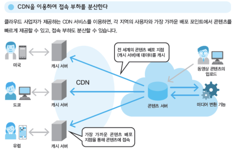 또한, CDN(Contents Delivery Network) 서비스를 함께 사용하여 접속량을 분 산시키는 방법도 있습니다. CDN은 웹의 컨텐츠를 전달하기 위해 최적화된 네 트워크입니다. 웹 콘텐츠가 저장된 서버 외의 또 다른 서버에 콘텐츠를 캐시해 두고, 사용자와 가까운 위치에 있는 서버가 콘텐츠를 대신 전달하면 접속량을 분산시킬 수 있습니다. 결과적으로 접속량이 급증해도 안정적으로 웹 사이트를 제공할 수 있게 됩니다. 대표적인 CDN 서비스로는 AWS의 Amazon CloudFront와 마이크로소프트의 Azure CDN 등이 있습니다.