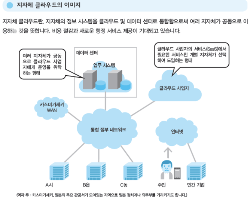 일본의 경우 현재 전국 1,700개 이상의 시/읍/면이 있습니다. 지자체 클라우드 는 전국의 지방 자치단체가 클라우드 기술을 전자 자치단체의 기반 구축으로 도 입하여, 정보 시스템의 효율적인 정비 및 운영, 그리고 주민 서비스 향상 등을 꾀하는 것을 목적으로 하고 있습니다.